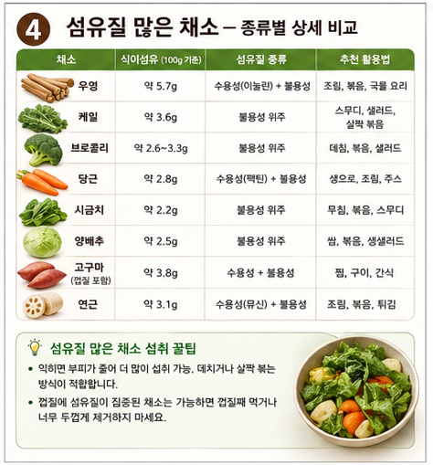 - 섬유질 많은 채소: 우엉·케일·브로콜리·고구마·연근이 상위권. 가능하면 껍질째, 너무 오래 익히지 않고 섭취.