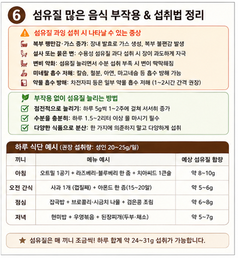 - 부작용 예방: 갑자기 늘리지 말고 점진적으로, 수분 섭취를 반드시 함께 늘려야 함.