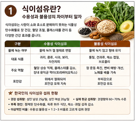 | 대표 식품 | 귀리, 콩류, 사과, 보리, 차전자피 | 통밀, 견과류, 채소 껍질, 브로콜리 |